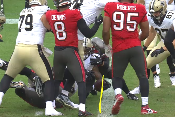 The Saints’ Devin Neal, gripping the ball in his left hand, smartly extends his arm (and thus the ball) above the goal line, then brings it back to his body, most likely to avoid having it stripped out of his grasp. At that point Neal gets mushed to the ground without the ball reaching the goal line. He’s down, he’s short, and in our view, it should be second-and-goal from inside the 1.