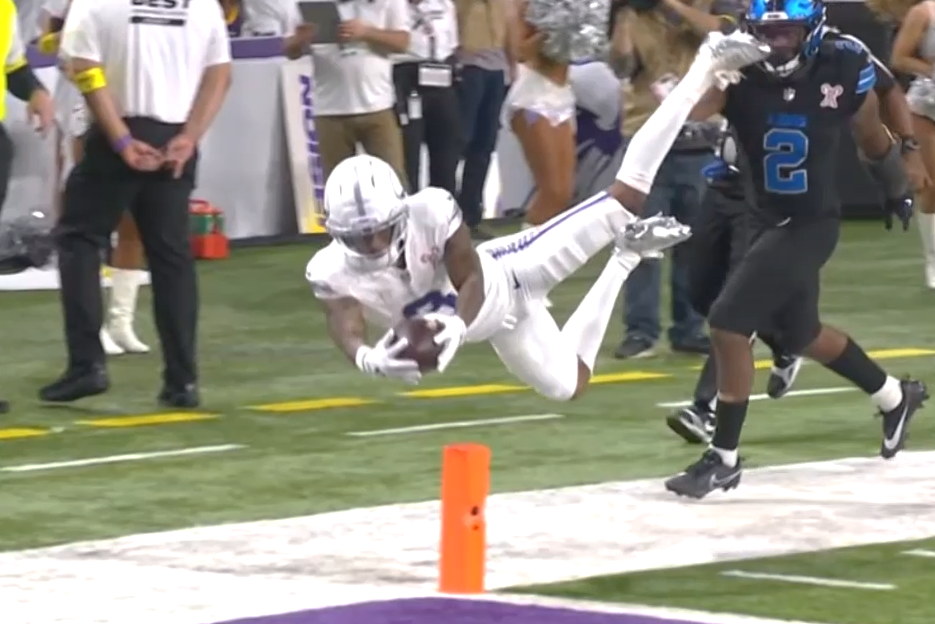 A last-second shove by Lions’ safety Daniel Thomas (2) sends Minnesota’s Jordan Addison flying out of bounds, keeping him out of the end zone. Good defense, right?