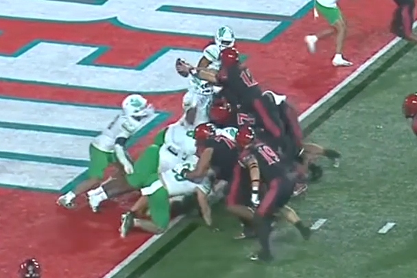 As usual, such tenaciousness is a big waste of effort, because the break-the-plane/goal line extended interpretation grants Addison six points even though he never touched the end zone. Never really got close to it, actually. Yet because Addison waved a fraction of the ball above the outside of the pylon — an object that itself is 100 percent out of bounds — Addison receives six points. Defensive coordinators just love rulings such as this. Hocus Bogus Rating: 5