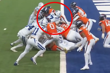 The Colts’ Daniel Jones gets collared by a Denver lineman and never gets his torso or legs into the end zone. Yet because he is perceived to have broken the plane, he gets six points. Not a convincing touchdown. Rating: 3