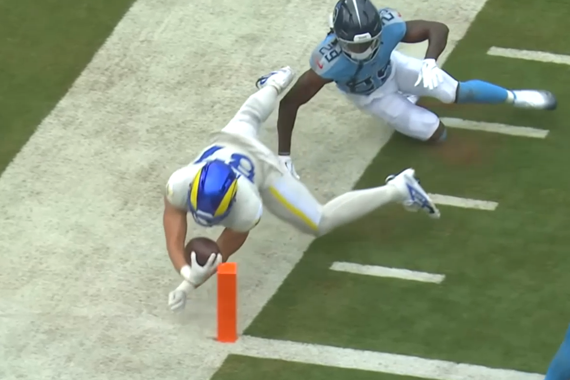 As he goes flying out of bounds, with no hope of contacting the end zone, the Rams’ Davis Allen barely grazes the outside of the pylon — and for this he is awarded six points. Astonishing.