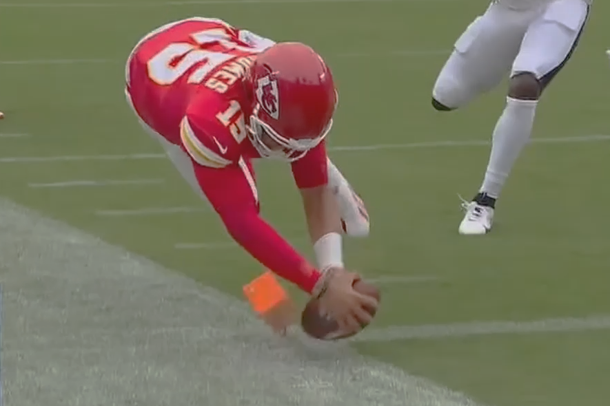 Kansas City’s Patrick Mahomes is a savvy competitor. If he can find an easy way to claim six points, he’ll take it. And Mahomes, to his credit, has figured out the easy way to a touchdown is not fighting through defenders to get into the end zone, but by running way wide of it and simply plunking a pylon.