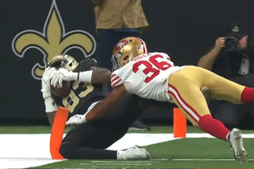 If, as the announcers speculated, that one foot down plus a shin down meets the two-feet down requirement for making a catch, then we would agree — this impressive grab by the Saints’ Juwan Johnson is good for six. But we don’t know for certain, and it’s mighty, mighty close.